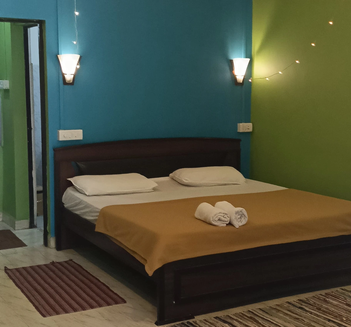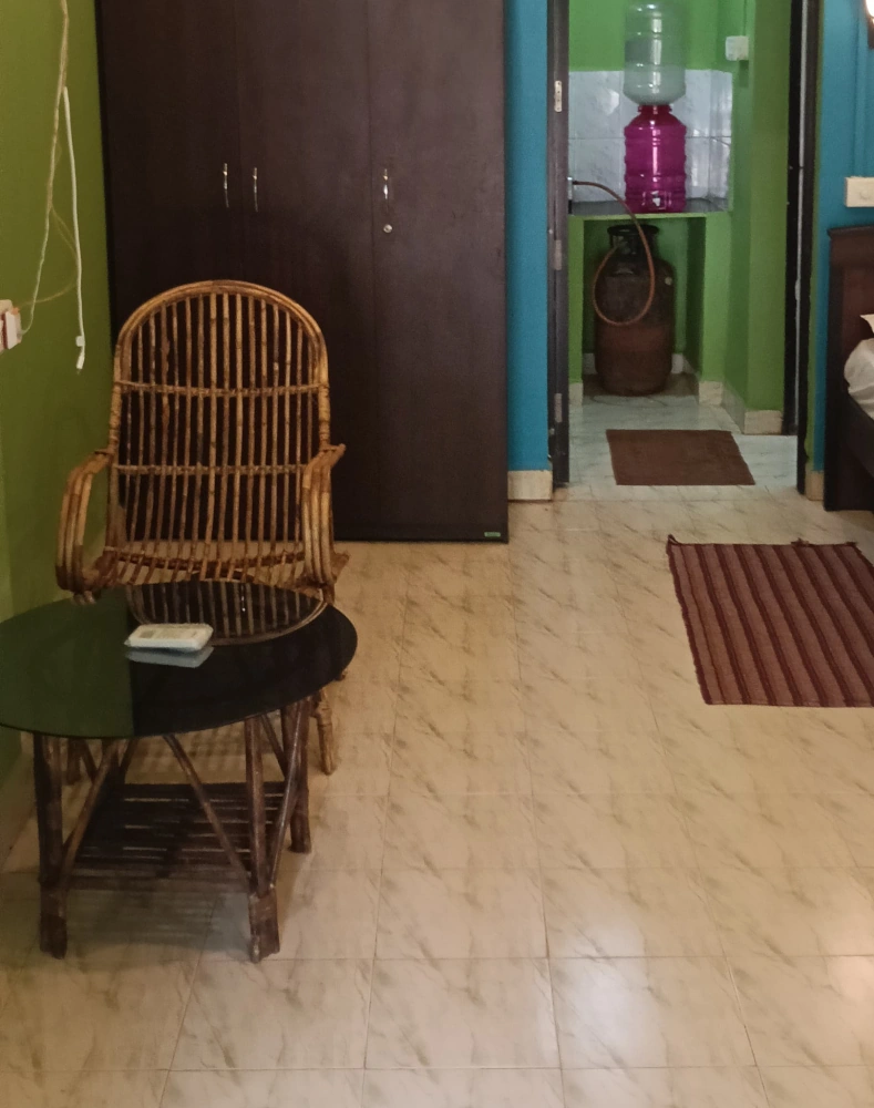 Unwind in our spacious AC bungalow rooms. These rooms feature a double bed and a single bed, accommodating up to 4 guests with the option of adding an extra mattress for an additional charge of Rs.500. The kitchenette includes a refrigerator, cutlery/crockery (available on request for Rs. 500), and an electric kettle with tea/coffee set.